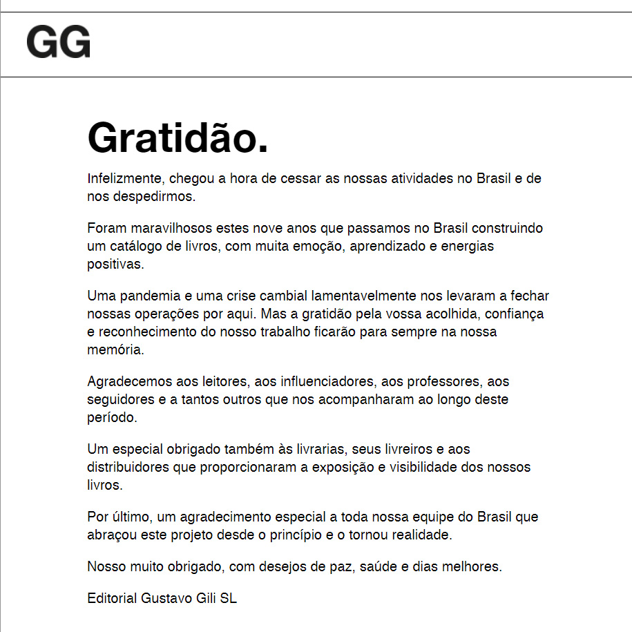 Hoje, dia 10/03/2021, enquanto ouço declaração do governo do estado de São Paulo sobre a epidemia, vejo que o Brasil bateu, mais uma vez, o recorde de mortos por covid-19 em 1 dia (1972 mortos em um dia) vejo também, se considerar as proporções, a notícia não tão grave que a Editora Gustavo Gili Brasil (GG) está encerrando suas atividades no Brasil.